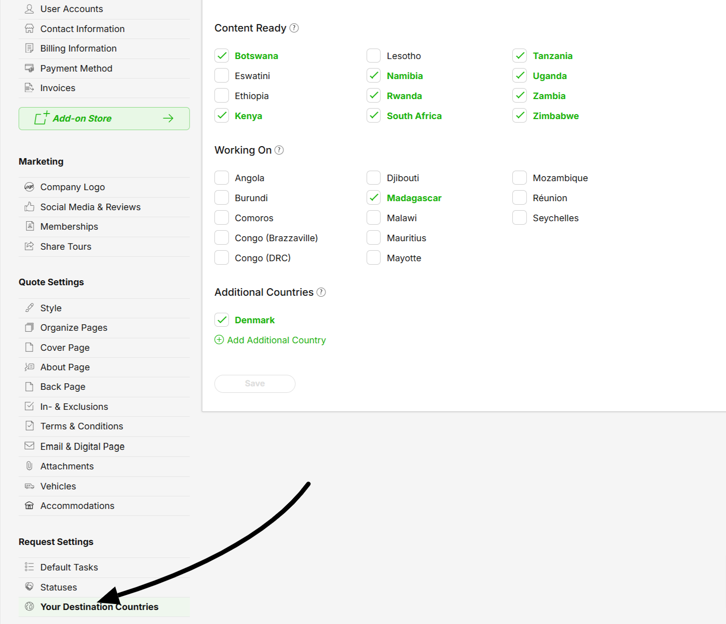 By selecting all the destination countries that your company operates in, SafariOffice will provide you with the correct content associated with these countries for the creation of your quotes and templates.