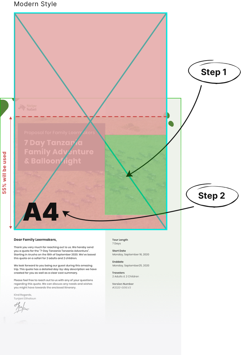 SafariOffice uses an A4 format for the cover and cover letter of your itineraries. When you want to create your own cover letter image then keep in mind the position of the subject and this A4 format.
