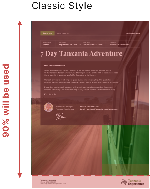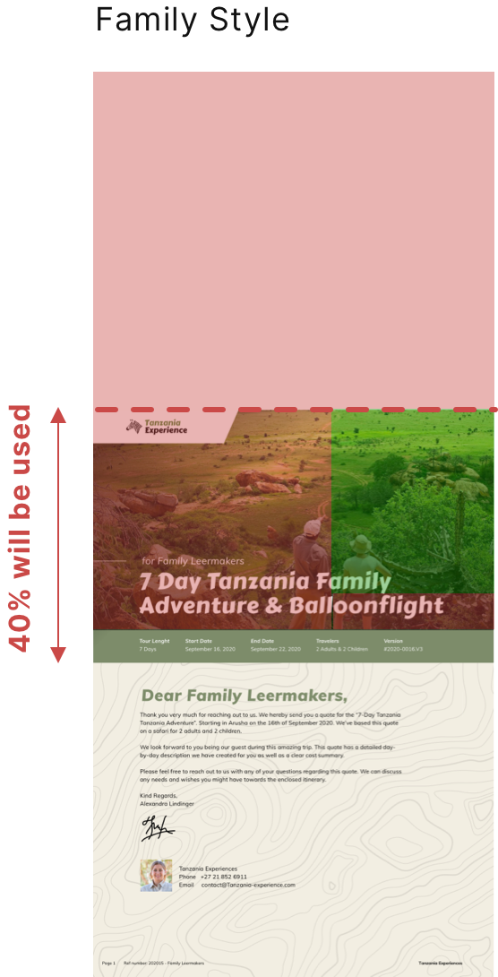 The digital itinerary will also use the cover as the starting image and will use the lower 50% for all styles (This is approximately as this is a responsive website and can be shown in different size on different devices.)