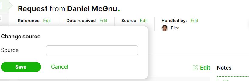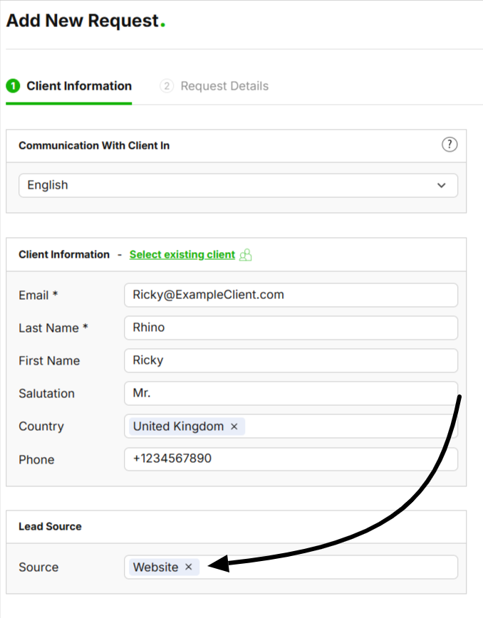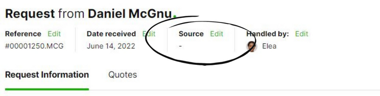If you want to add the source from which you received the request, this is done on the request page as you add the client information.