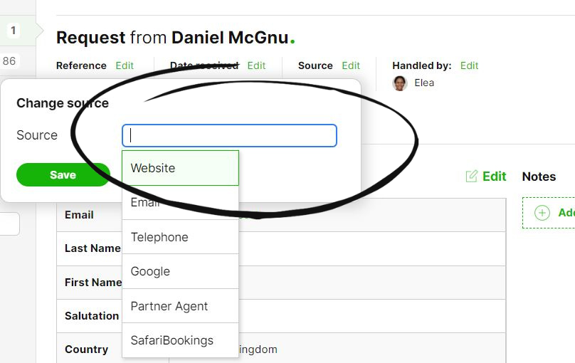 When managing a (new) request in SafariOffice, you can indicate from which source you received the request.