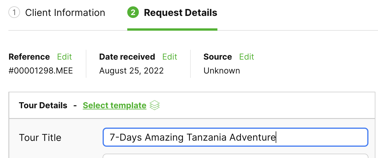 When creating a new request in SafariOffice, you will be asked to set up the tour details for this request. You can set up the tour details in two ways: manually type in the tour details for a new itinerary or choose a pre-created template.