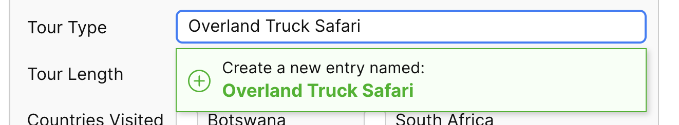 You are not limited to this drop-down list. Please note that you are able to customize the Tour Type according to your needs. For example, if you want to provide an overland truck safari, simply type in 'Overland Truck Safari' in the empty field and 'click enter' or 'click the green +'.