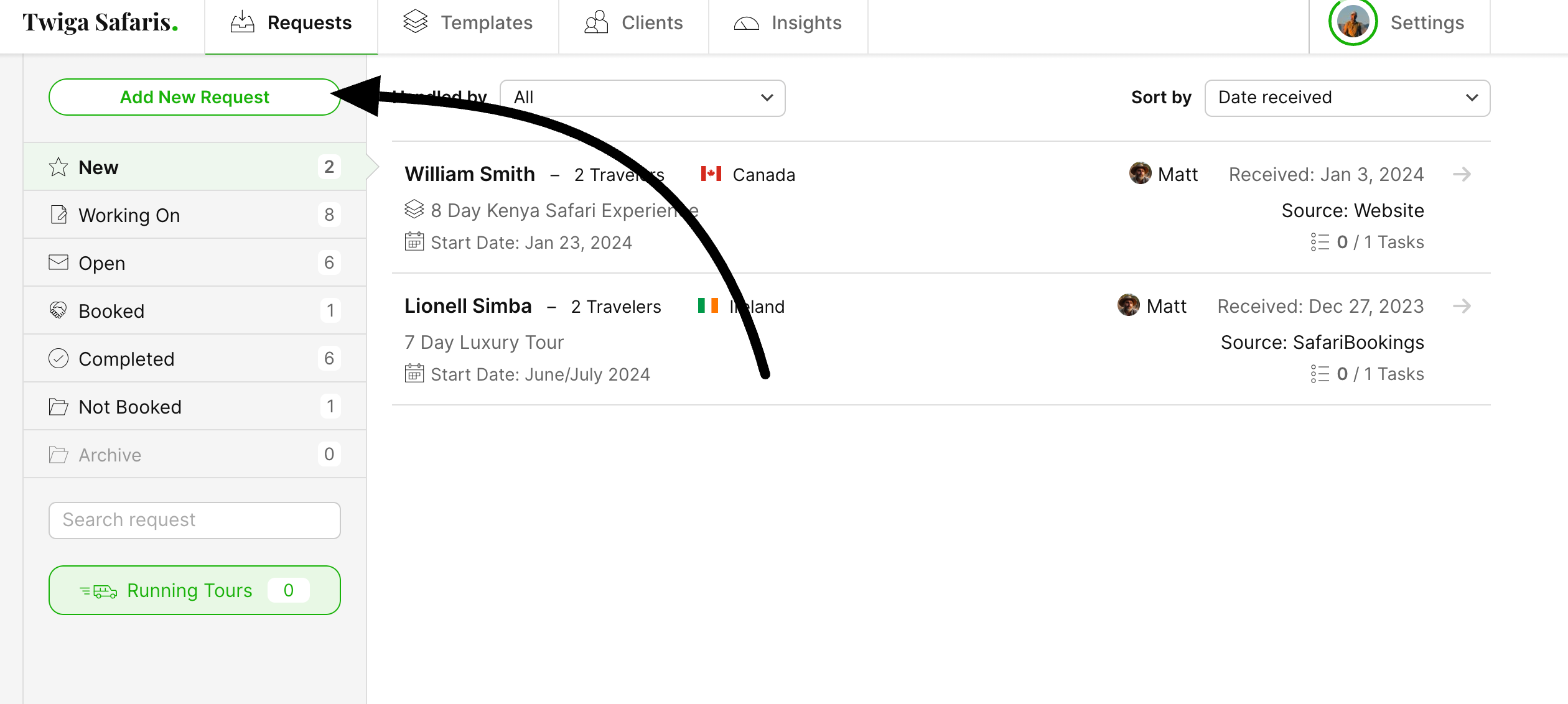 Choose whether it's for a new or existing client, click "Create", proceed to add the client information, and fill in the tour request details.