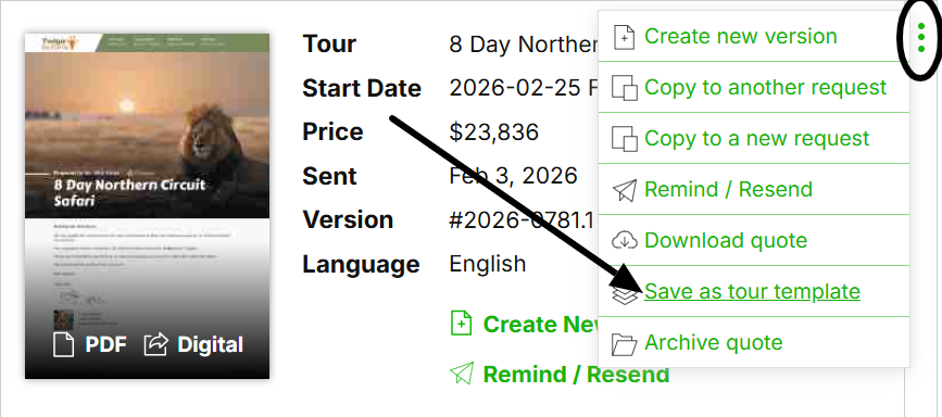 If you’ve already created a quote and later receive another request for the same or a very similar tour, there’s no need to start from scratch. You can simply convert that quote into a tour template and reuse it for future clients.