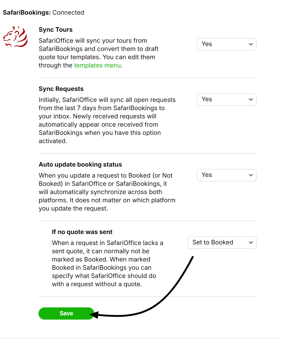 Once you're connected, Sync your requests and tour templates then click SAVE.