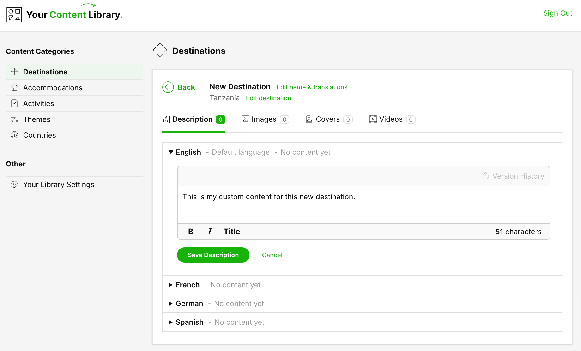 After clicking Add New Content in the Destination Section follow these steps to add descriptions.