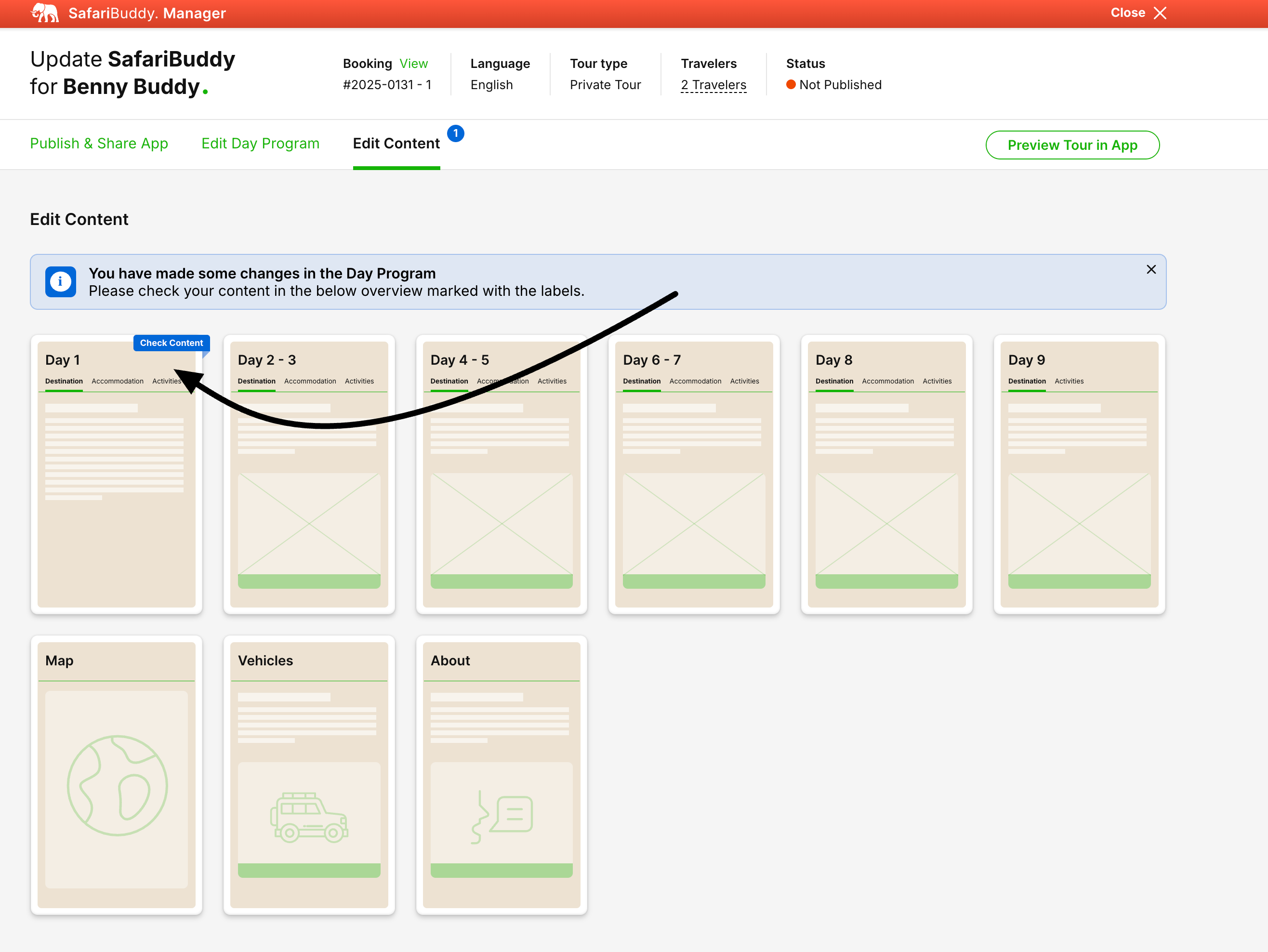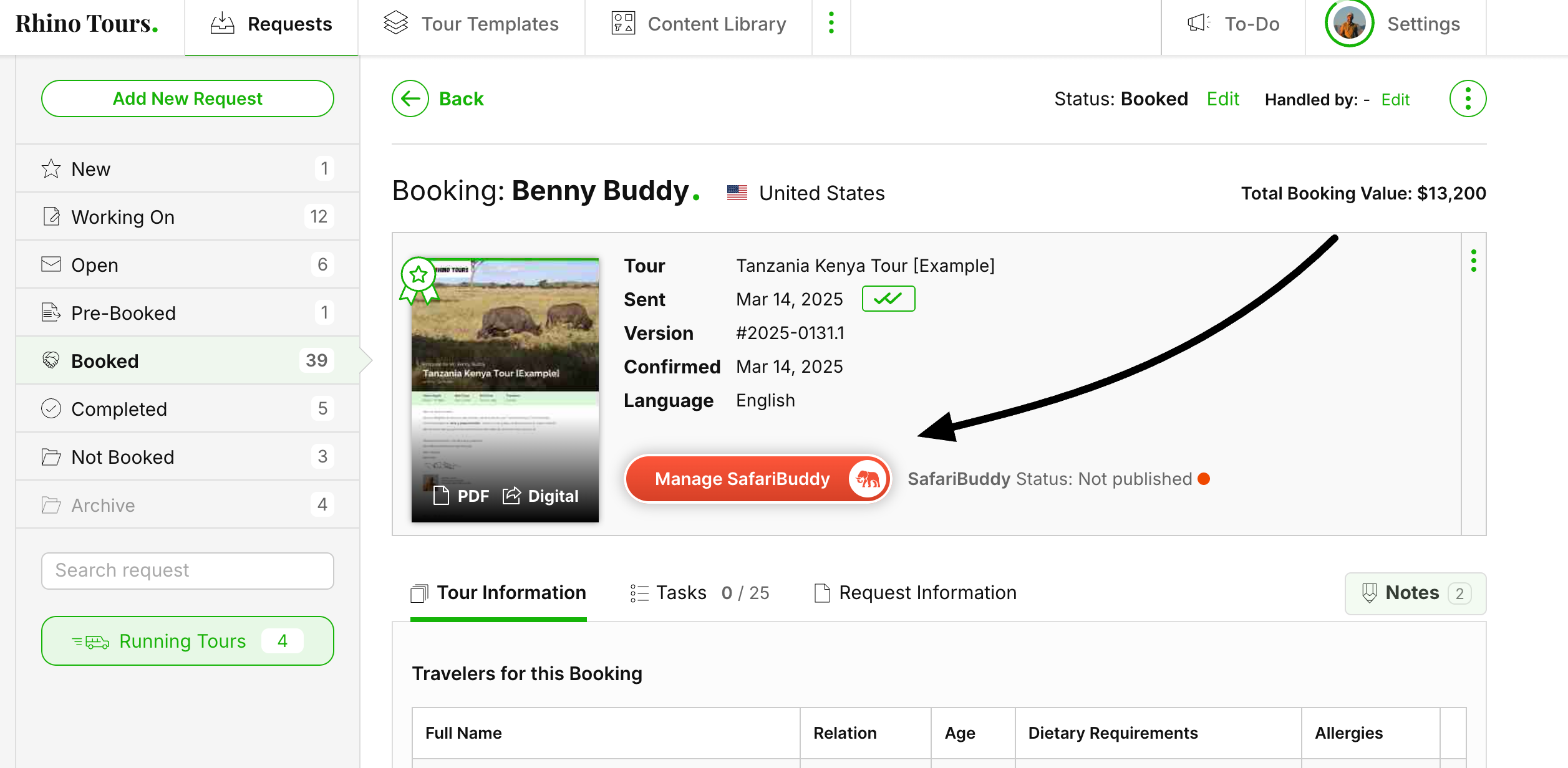 The SafariBuddy Manager allows you to share a booked tour with your clients through the SafariBuddy app. Once a tour is confirmed, you can activate and manage the app for the client to provide a seamless travel experience. Clients get access to all travel details and information, and can share their needs like dietary requirements or information on allergies.