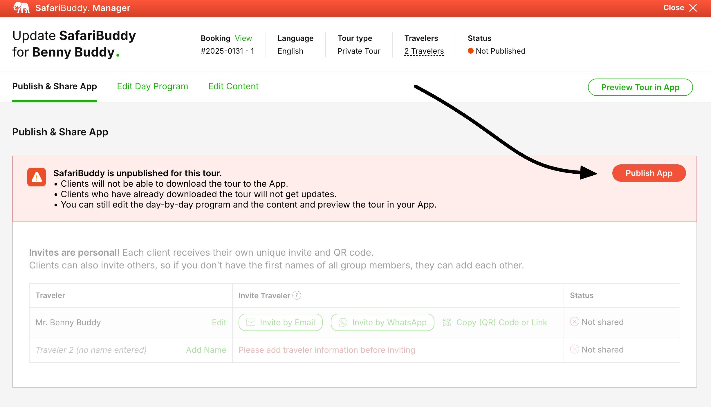 Clients can share the app and tour with fellow travelers, as long as there are slots available (never more than indicated as booked for the group). They can do this from the App.