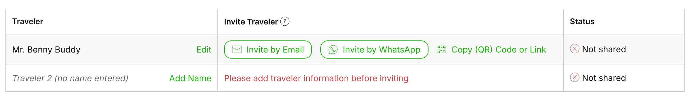 In the third column of the traveler table, you’ll see the status of each invite: