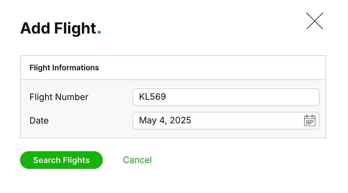 Enter the Flight Number (you can use IATA or ICAO codes) and the Date to search available flights.