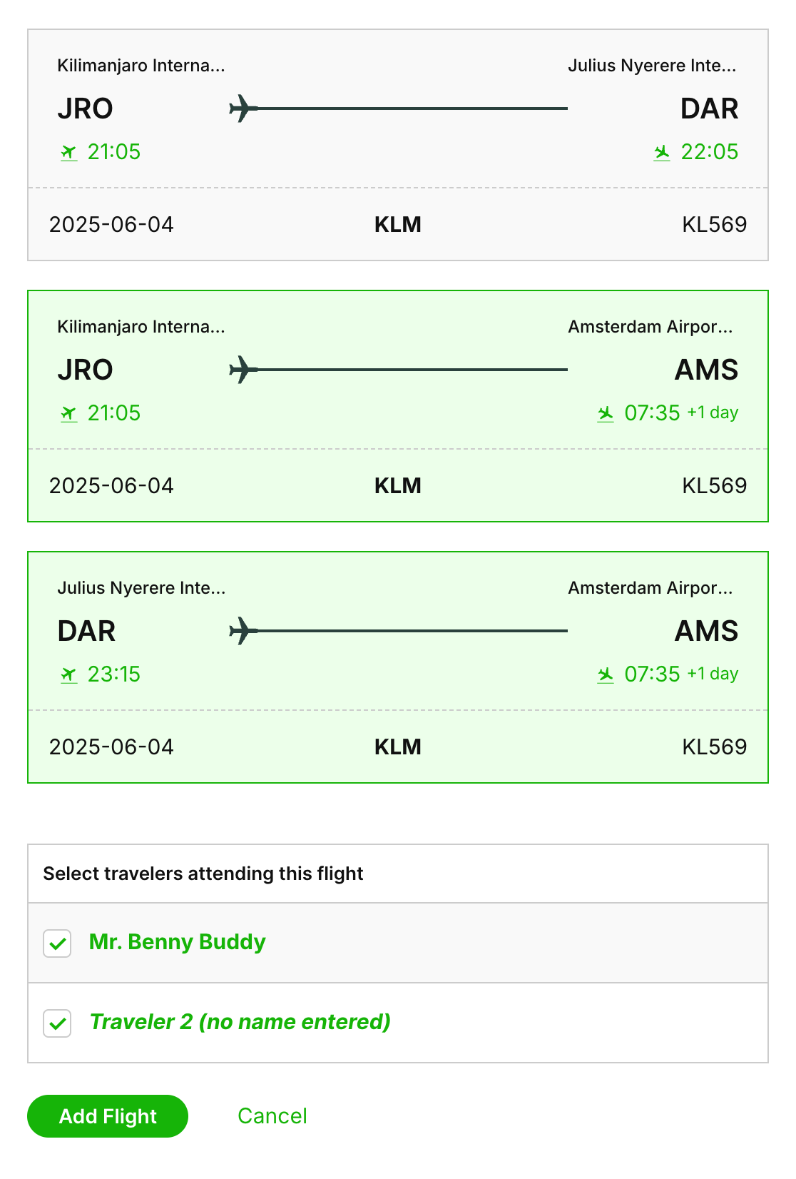 Select the correct flight(s) from the results and assign it to the relevant client(s) from the flight (by default, all travelers are selected. Click "Add Flight"