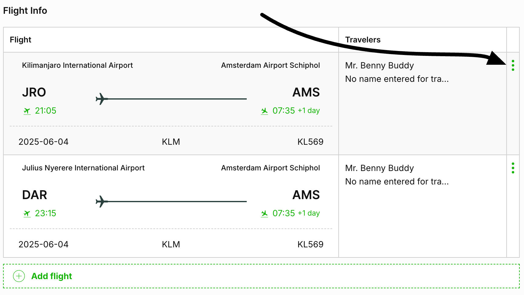 You can add flights manually in the SafariOffice backend if you already have the information. If you use SafariBuddy App, clients can enter their flight details directly through the app.